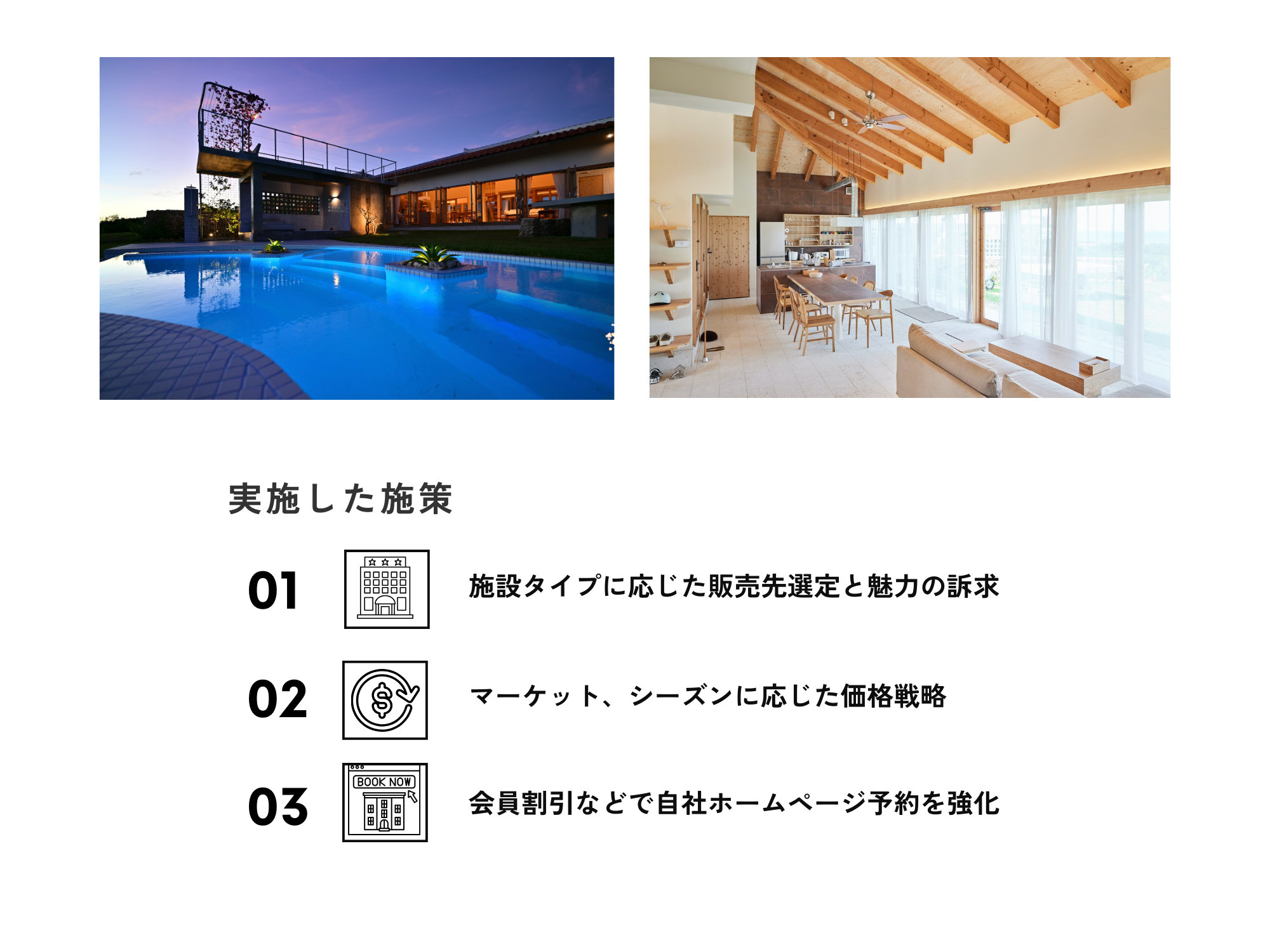宿泊施設向けコンサルティング 宿泊施設の運営効率化や収益向上を目指し、施設の特性に応じた最適なソリューションを提案。 事例①石垣ヒルズ 2024年6月オープンの石垣ヒルズは、2部屋ながら販売開始後過4か月間で、稼働率95%超えいう高い実績を出しました。 適切な販売先の選定と、エリアの需要に合わせたレベニューマネージメントで高単価の平均室料を維持しつつ、安定した収益を生み出しました。 また、自社ホームページからの予約比率が60%を超えており、OTA手数料の削減にも繋がりました。 開業2年目の8月も売り上げ前年比113%、稼働率96.7%、平均室料は10万円を超え高収益をキープしています。 事例②Resort Villa KAPUKA古宇利島 2024年2月オープン 沖縄本島にあるResort Villa KAPUKA古宇利島。 改行して1年経過し販売方法が確立できておらず、売り上げが低迷していた中で、2025年4月から運用開始しました。 運用後予約数も増えたことで、2025年8月は昨年対比1,474%、稼働率93.5%を達成しました。 系列のResort Villa KAPUKA瀬底島も同時に運用開始し、5棟のVillaは2025年8月の稼働率99.6%とほぼ満室の状況となりました。 ホームページ制作 宿泊施設、観光ユーザー向けに、ユーザーフレンドリーで魅力的なデザインのウェブサイトを制作。オンラインでの存在感を強化し、宿泊施設の魅力をアピールし予約を促進する仕組みを作り上げました。 事例①石垣島ホテルプロジェクト 石垣島2216(ishigakijima2216.com)では、訪問者に地域の魅力を伝えるためのデザインを採用しました。 シンプルで洗練されたレイアウトと、直感的に使いやすいナビゲーションを構築し、予約率向上に貢献しています。 自然を感じる配色と地域に即した写真でブランドイメージを強化。 訪問者が必要な情報(予約・アクセス・観光スポット)に簡単にアクセスできる構造にしています。 レスポンシブデザインでスマートフォンでも快適に閲覧可能。 多言語化で海外のユーザー獲得にも力を入れたページです。 事例② 沖縄観光ガイドプロジェクト 沖縄観光ガイド(okinawa-travelguide.com)では、情報量が多いコンテンツを整理し、訪問者が迷わず目的の情報にたどり着ける構造を実現しました。 魅力的な写真と予約を促すCTAを適切に配置することで、ユーザーの予約率を向上させています。 観光スポット情報をカード形式で整理し、視認性を向上し、訪問者をアクションに誘導する、わかりやすいボタンデザインを採用しています。 情報ごとのカテゴリー分類でほしい情報に簡単にアクセスでき、検索を意識したSEOの構造にしています。