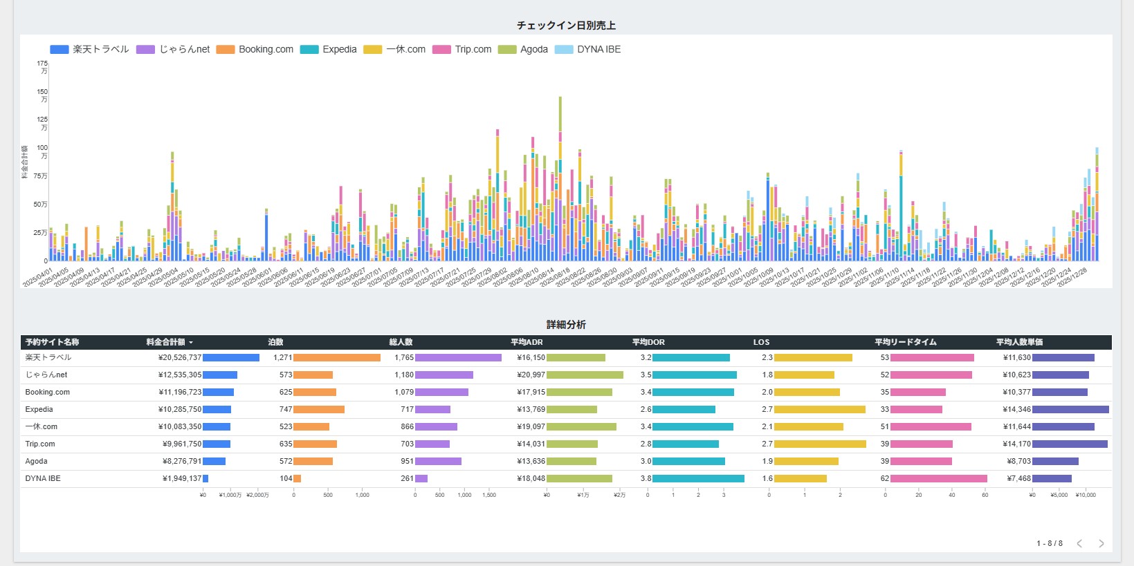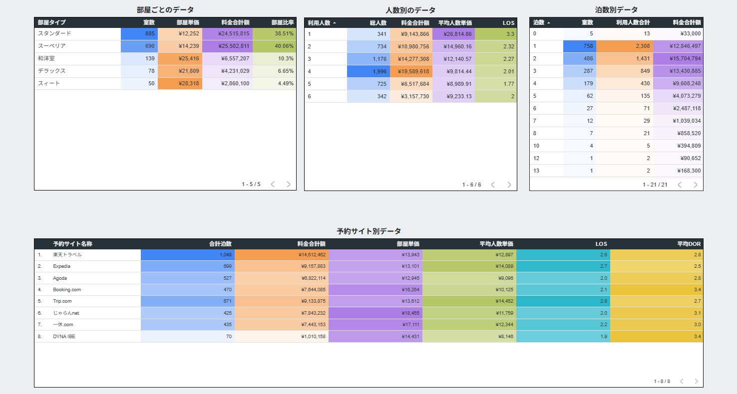 ・セグメント別可視化:宿泊タイプ、チャネル、時期別のパフォーマンスを一目で把握。